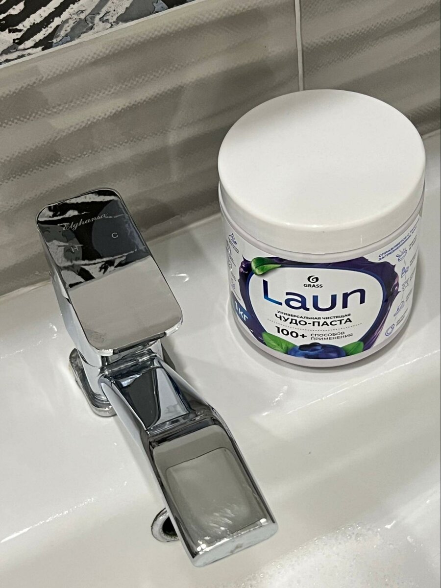 Потом взялась за раковину из искусственного камня. Там был налет, с которым обычные средства справлялись не очень. С пастой LAUN получилось хорошо: нанесла, оставила минут на пять, потом смыла.
